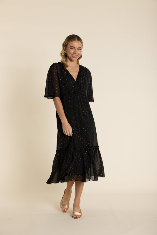 2920 Georgette Midi Ruffle Dress with gold lurex