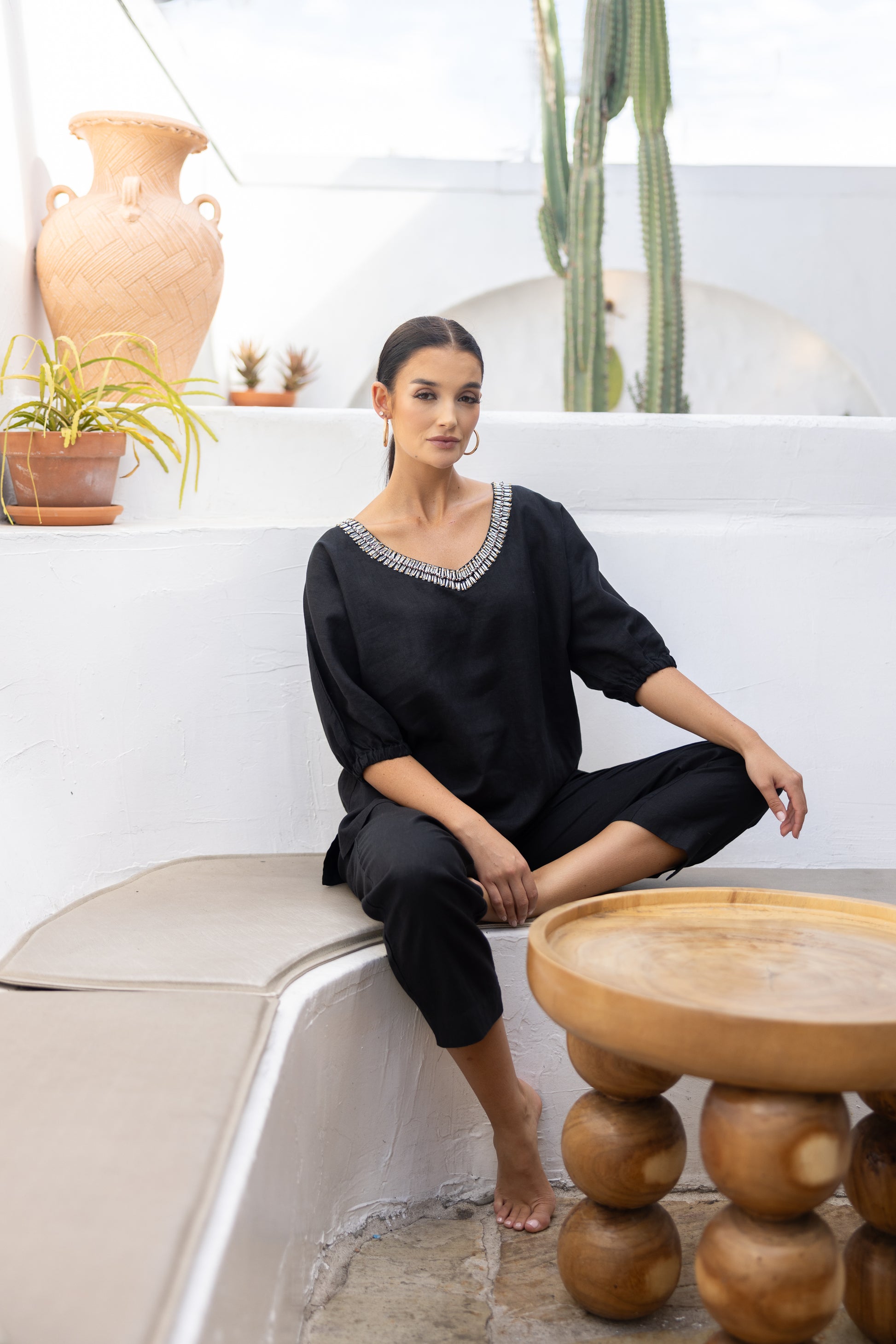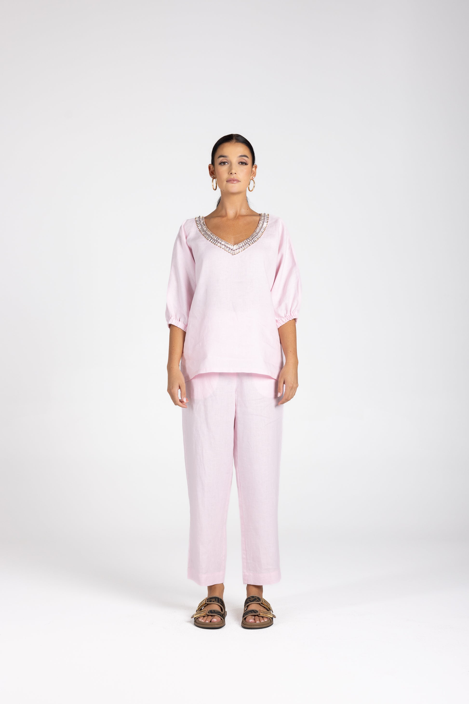 Introducing the Linen V-Neck Beaded Top, a quintessential blend of elegance and comfort. Crafted from 100% premium linen, this top ensures a breathable fit that keeps you cool on warm days while maintaining a chic, polished look. The delicate beading along the V-neckline adds a touch of glamour, making it versatile for both daytime and evening wear. Perfectly pairing with your favourite jeans or a sophisticated skirt, this top is a timeless addition to your wardrobe. Embrace effortless style with this exquisite piece that combines luxury with casual ease.